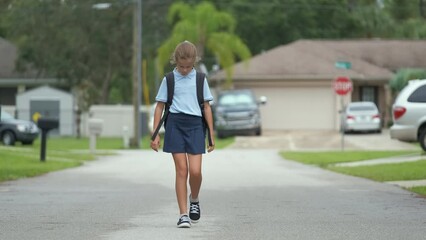 Lonely child girl walking sadly on rural road returning home from school