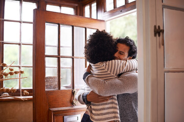 Happy affectionate couple hugging at front door of house