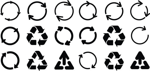 Collection of black recycle symbols and circular arrows illustrating reuse and sustainability concepts