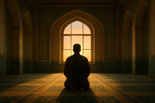 Serene moment of prayer in mosque soft light and patterned carpet reverence