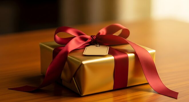 Elegant Gold Ribbon Bow on a Gift Box Festive Celebration of Giving, Perfect for Holidays, Anniversaries, and Special Occasions