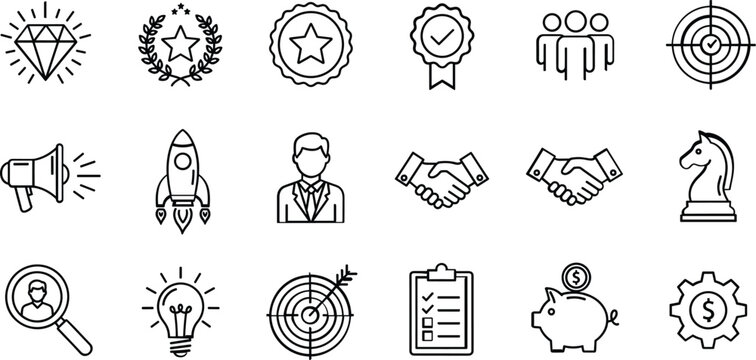 Minimalist Business Success and Achievement Line Icons Set Featuring Diamond, Rocket, Target, Handshake, and Corporate Strategy Symbols for Web and Mobile.