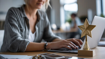 Golden star award trophy symbolizing success in a modern office with blurred business professionals