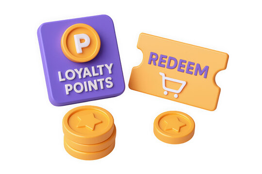 Colorful 3D icons representing loyalty points and redemption, symbolizing customer rewards and incentives in shopping.