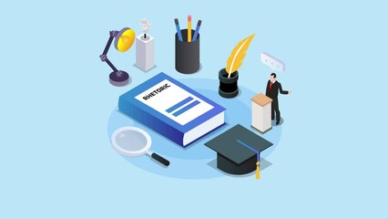 Rhetoric being studied, examined - under close inspection. Most important subjects and ideas closely related to rhetoric written on a blackboard inspected by a magnifying glass. ,3d illustration