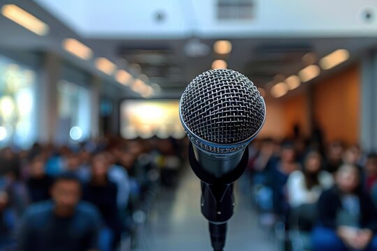Rear view of a long-haired blond woman speaking from a lectern to a large crowd, made with generative ai