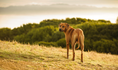 Rhodesian Ridgeback dog outdoor portrait standing on hillside overlooking water
