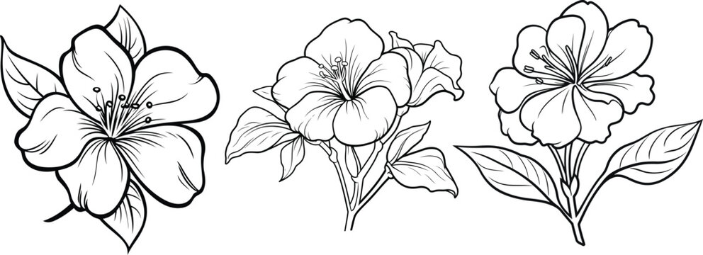 Collection of jasmine, trumpet, and rhododendron flower line art vector illustrations set isolated on transparent background. Modern minimalist design for logo, tattoo, wall art, poster,