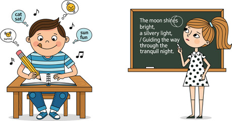 Children learning rhyming words and poetry writing in classroom illustration educational kids language arts creative learning concept
