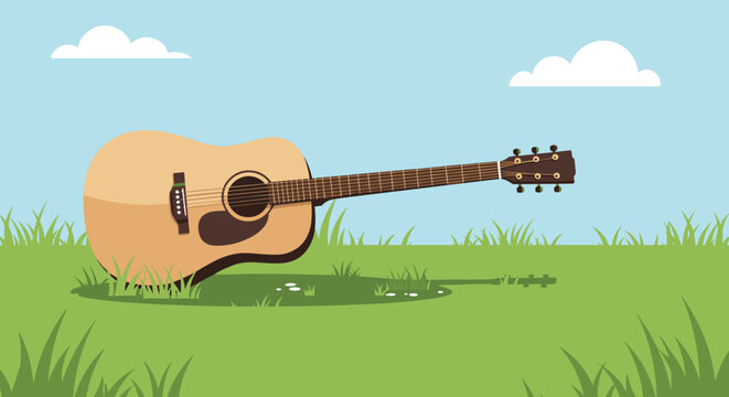 Acoustic guitar resting on grass under blue sky with clouds,  Suitable for outdoor picnics, music events and leisure activities