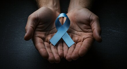 A light blue awareness ribbon rests in the open hands of a man against a dark, textured background, symbolizing support and hope.
