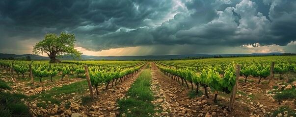 vineyard during a stormy day during spring in the denomination of origin region of Ribera del Duero in the province of Valladolid in Spain
