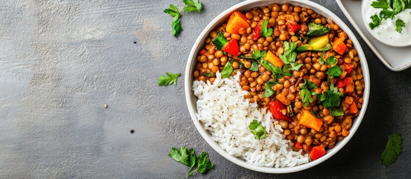 Vegan lentil rice bowl with colorful vegetables served in a white ceramic dish showcasing healthy meal options for advertisements or promotions