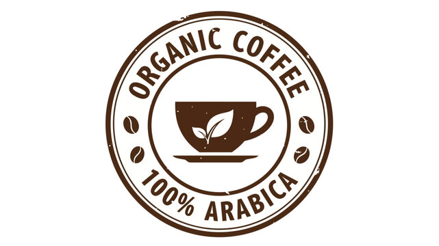 Vector illustration of an organic coffee badge, elegantly designed with a rustic, vintage stamp aesthetic, highlighting 100% Arabica beans. Features a stylized coffee cup adorned with a delicate leaf