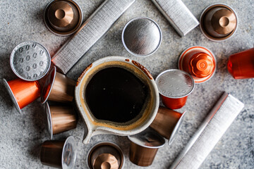 Coffee cup surrounded by ground coffee and beans on a dark surface