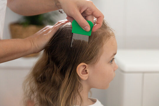 A woman helps to get rid of lice and parasites on the head of a little girl, combs her head with a special comb. Treatment of lice and nits