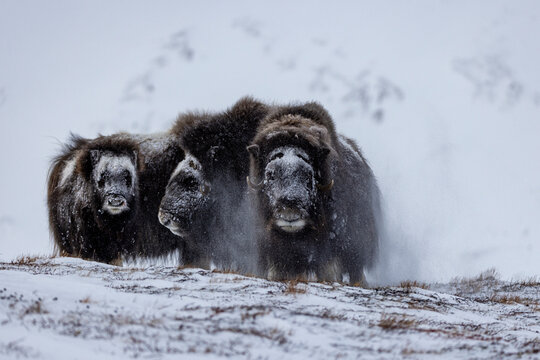 a group of musk oxen get rid of their snow