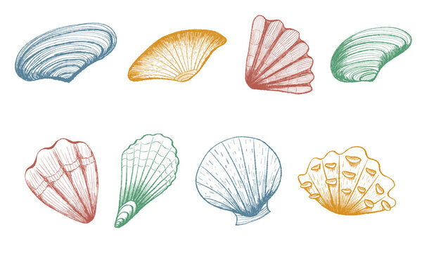 Colorful engraved seashell set. Hand drawn ocean mollusks in detailed vintage sketch ink style. Vector collection on white background for print, decor, stickers