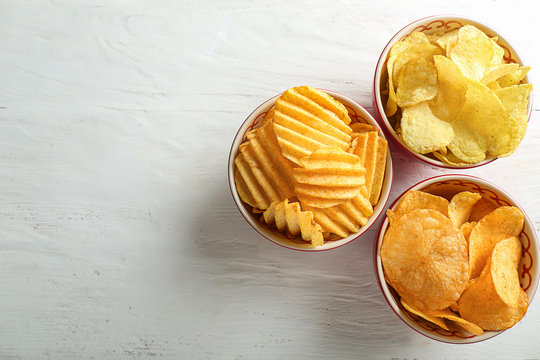 Bowls with tasty crispy potato chips on white wooden table
