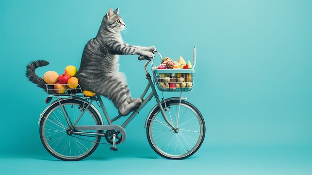 cute cat riding a bike with a bin loaded with hidden little goodies on blue background