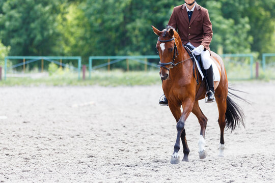 Rider in formal attire gracefully trotting a horse in an outdoor equestrian arena on a sunny day