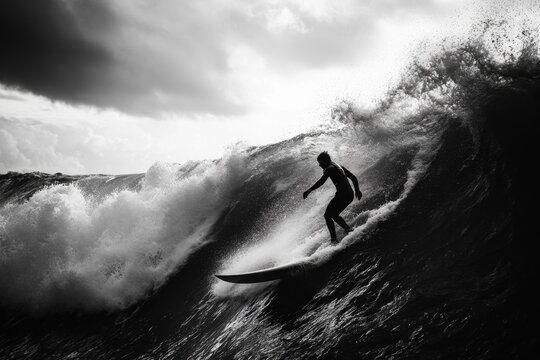 A surfer riding a big wave at sunset. Great for extreme sports, adventure travel and beach lifestyle.