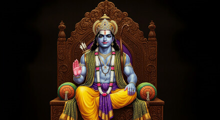 A majestic illustration of Lord Rama seated on a royal throne, adorned with traditional jewelry and holding a bow, symbolizing righteousness and courage