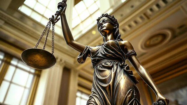 Lady Justice: Bronze Statue of Impartiality and Law in a Grand Courtroom