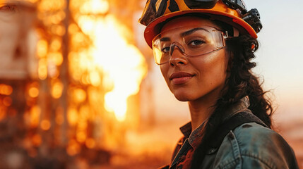 Portrait of empowered female worker at oil rig. Generative AI image