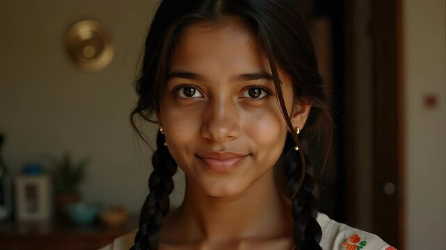 Portrait of a Teenage Girl with Long Braids Subtle Makeup and Kohl Rimmed Eyes Medium Brown Skin Tone Indian Ethnicity