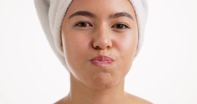 Mouthwash, face and woman cleaning for dental health, teeth wellness and gum care. Hygiene, oral rinse and person with portrait, antibacterial and morning routine on white background space in studio
