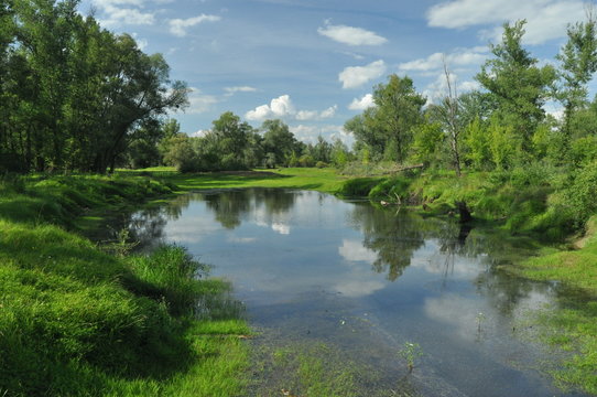 Wet meadow and riparian forest oxbow lake. Vistula Valley. Spring, freshness and juiciness