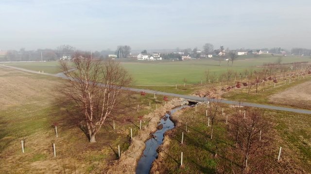 Aerial of riparian buffer, trees and vegetation protecting stream, water quality from sediment and nutrient runoff, EPA controls