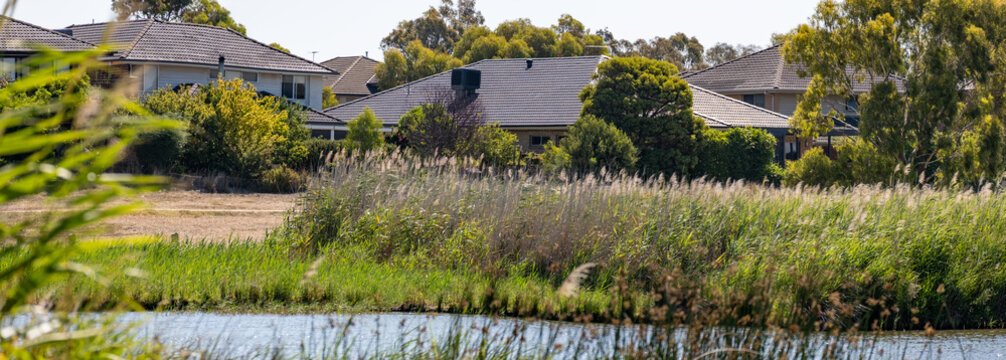 Skeleton Creek in Point Cook, with reeds and grasses growing along the water's edge, modern suburban houses near the wetland. Natural waterway within a residential development in Melbourne Australia.