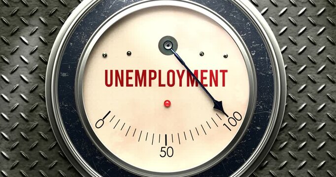 Unemployment  meter that is hitting a full scale, showing rising levels of unemployment, overload of it, too much of it. Maximum value, off the charts.