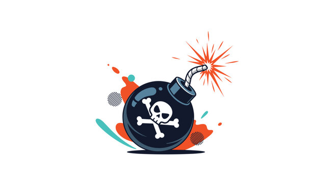 Cartoon illustration of a round black bomb with a skull and crossbones symbol and a lit fuse ready to explode vector.