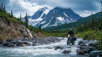 Motorcyclist crossing rocky river in mountains. (1)