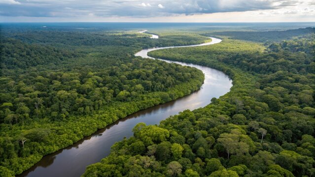Aerial view of amazon rainforest with river winding through lush green trees landscape scenery beauty 100