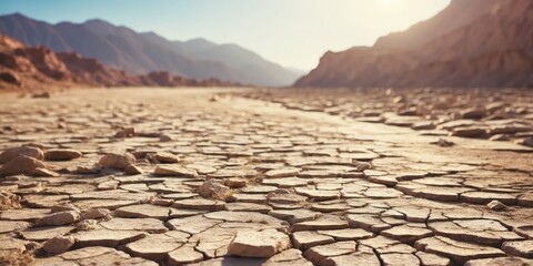 A barren, dry riverbed with cracked soil, Global warming.