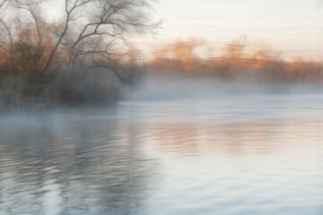 Serene riverine scene with riparian elements, featuring a misty, sunlit river winding through a lush, verdant landscape, perfect for a tranquil nature background image. Watercolor style, high