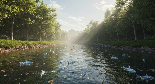Environmental impact showcasing plastic waste accumulation in a pristine riverine setting