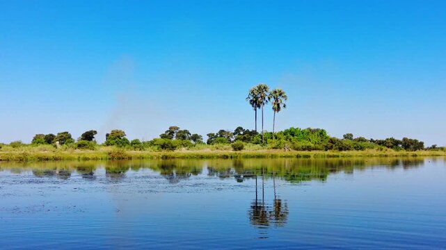 Static view across a calm Okavango Delta lagoon shows rippling blue water mirroring tall palm trees and lush riverine forest on a low island under a clear midday sky in northern Botswana