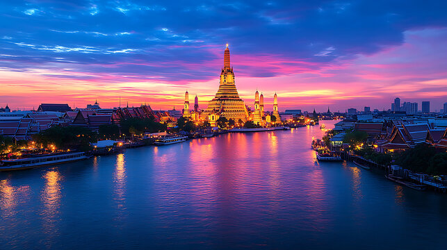 Wat Arun bathed in sunset light, Bangkok’s riverside temple glowing in golden hues, reflecting serene beauty and traditional Thai architectural grandeur