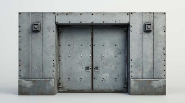 Heavy industrial metal door with riveted panels and square detailing in a gray steel finish for secure entry access