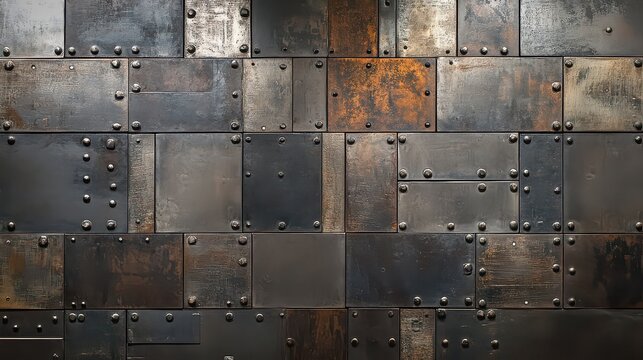 Close up of riveted metal plates forming a patchwork pattern with dark tones and rust