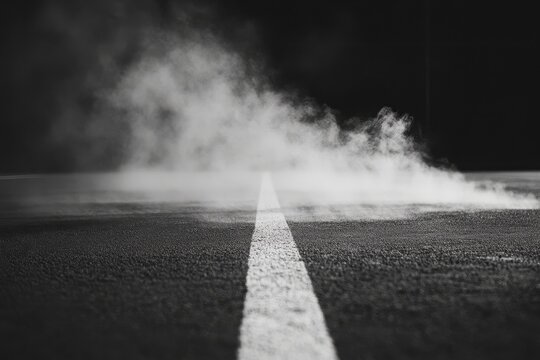 Smoke rising along a dark asphalt road with a central white line on a cool evening