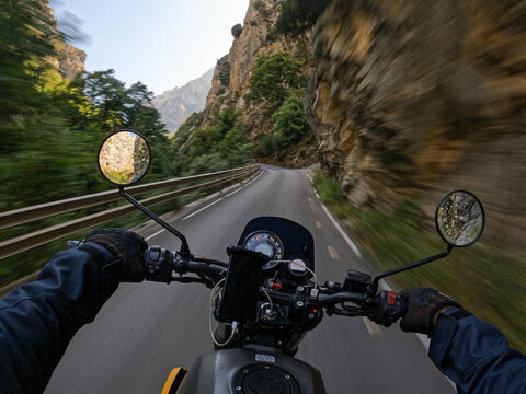 POV speedy mountain road ride on an adventure motorcycle