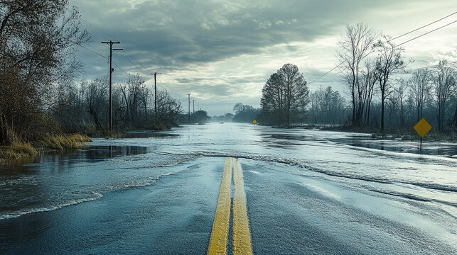 Dramatic wet highway stretching into distance evokes travel road trip and weather conditions