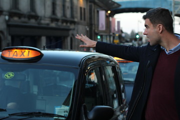 Young handsome man on side of a road, hailing and stopping a taxi cab