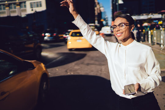 Happy smiling dark skinned woman waving with hand for catching yellow cab and getting to destination in time, cheerful female in eyewear for vision correction hailing taxi in financial district